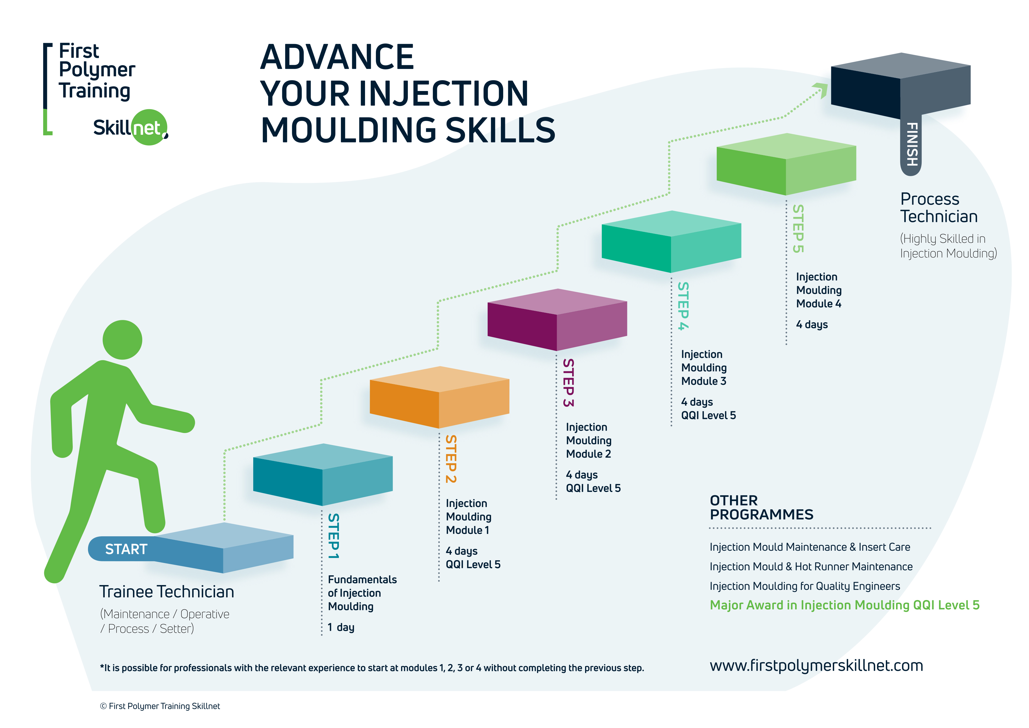 Steve O'Leary has delivered training in Injection Moulding for First Polymer Training since 2000, initially joining FPT Skillnet as the Training Centre Manager. Previous to this he worked as an Extrusion/ Injection Moulding Engineer with Boston Scientific in Galway, Extrusion Technician and Extrusion Supervisor with Sherwood Medical in Tullamore (currently Medtronic Tullamore) and as an Injection Moulding Technician with Tubex in Nenagh, Co. Tipperary. He graduated from Athlone IT having studied Plastics Engineering from 1988 to 1992.