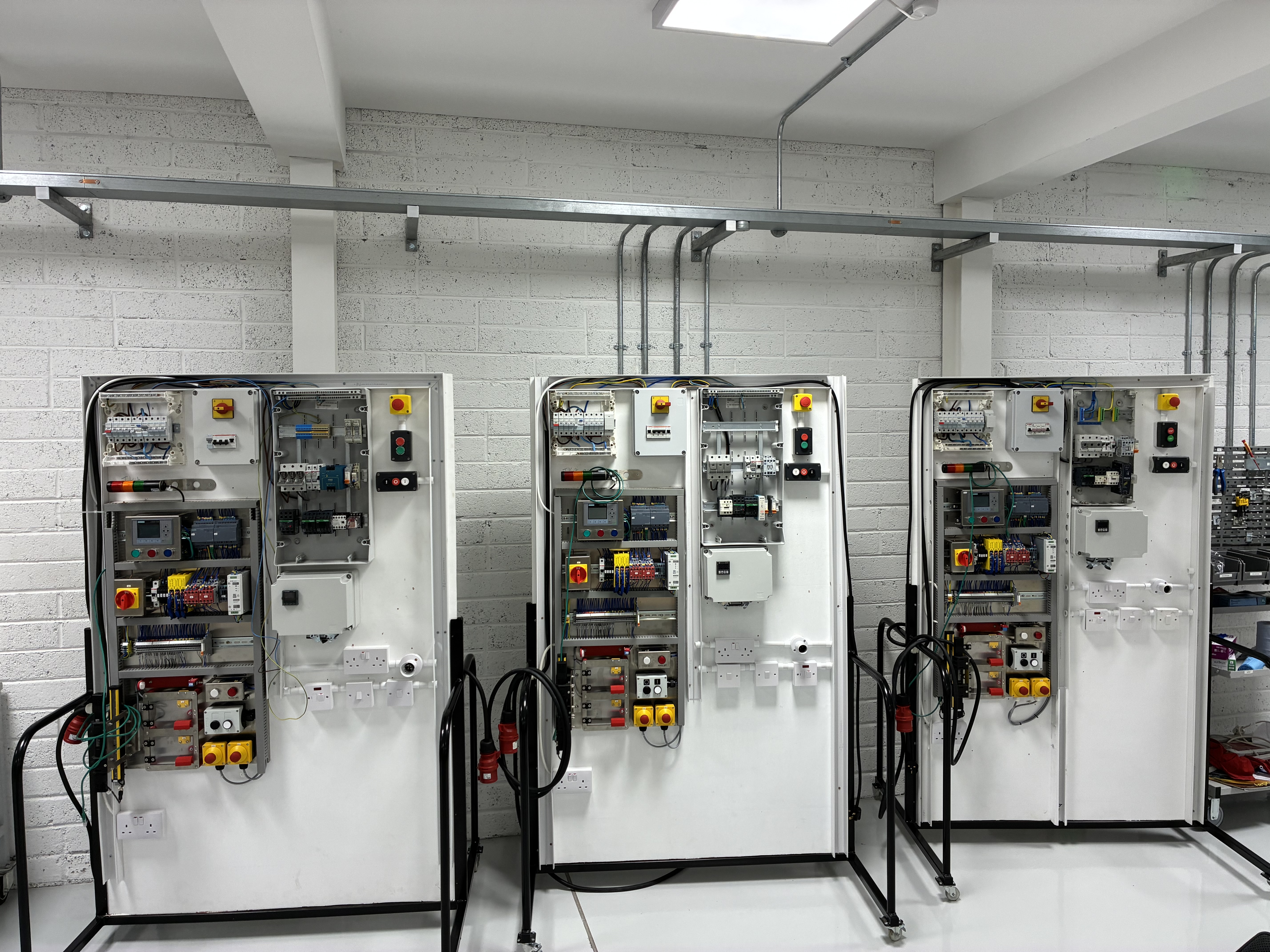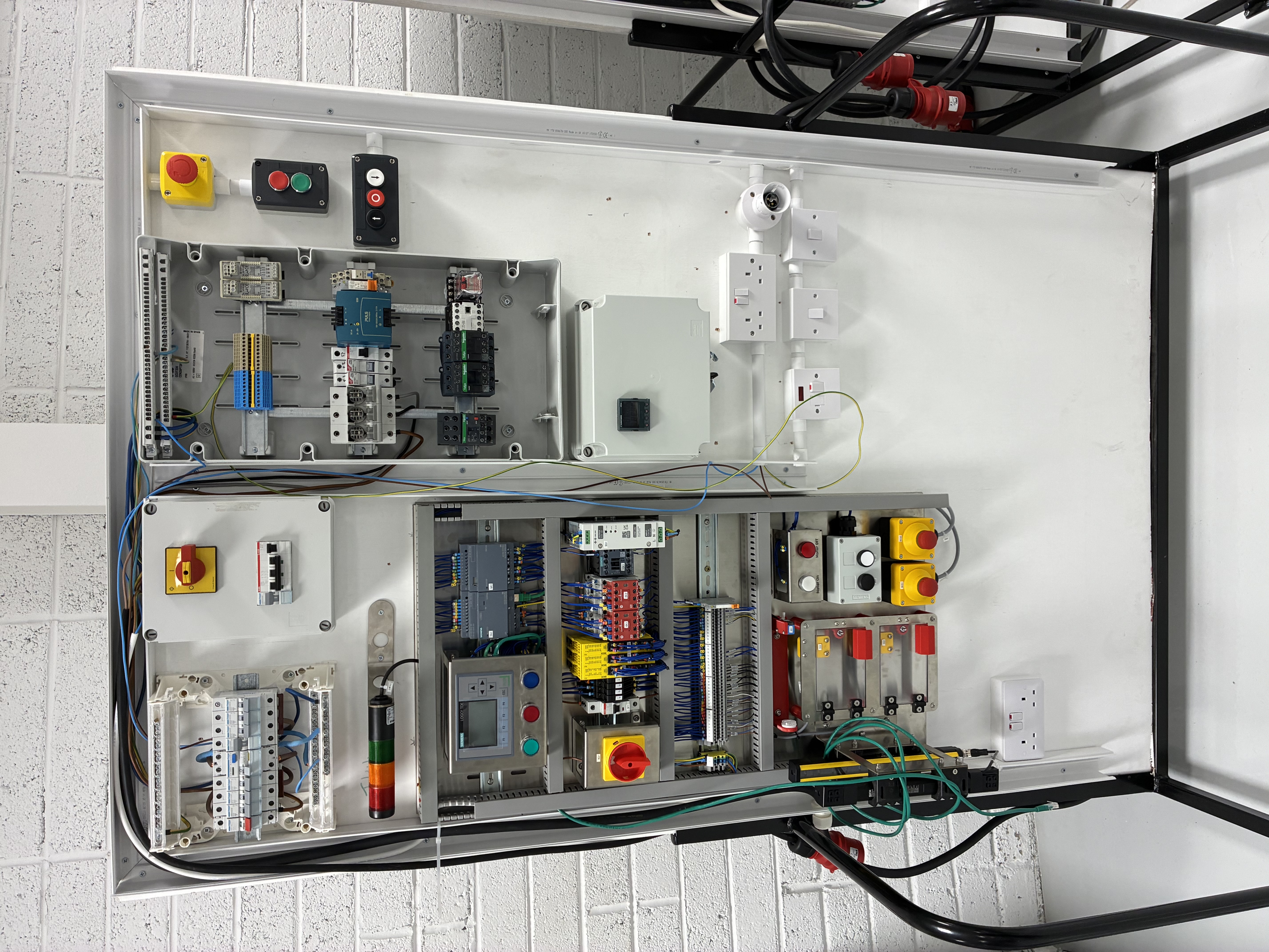 Our mobile Electrical training boards have 3 sections, single-phase household circuits learning how 1 & 2-way switches, cookers, and showers are wired is a very effective and interesting introduction to electrical circuits, 24-volt control circuits and finally 3 phase circuits used to control heating on an injection moulding injection unit control circuit.